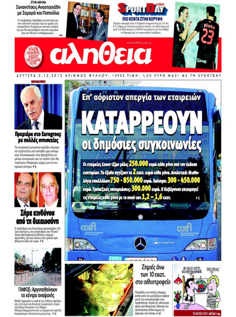 Η “Αλήθεια” υπό τον τίτλο “Καταρρέουν οι δημόσιες συγκοινωνίες” αναφέρεται στην επ’ αόριστον απεργία των εταιρειών λεωφορείων και γράφει πως ενώ οι εταιρείες έχουν τζίρο μόλις 250.000 ευρώ κάθε μήνα από την έκδοση εισιτηρίων, τα έξοδα αγγίζουν τα 2 εκατ. ευρώ κάθε μήνα. Σε άλλο θέμα γράφει ότι ο υποψήφιος Πρόεδρος Νίκος Αναστασιάδης συναντάται με Σαμαρά και Παπούλια, ενώ σε ομιλία του υποσχέθηκε διαφάνεια παντού τονίζοντας ότι θα κατατεθούν σχετικά νομοσχέδια στη Βουλή το Φεβρουάριο. Αλλού γράφει ότι εκπέμπεται σήμα κινδύνου από τη δικαιοσύνη, με τον Πρόεδρο του Ανωτάτου Δικαστηρίου Πέτρο Αρτέμη και τον Πρόεδρο του Παγκύπριου Δικηγορικού Συλλόγου Δώρο Ιωαννίδη να ζητούν λύσεις στα χρόνια προβλήματα εδώ και τώρα.