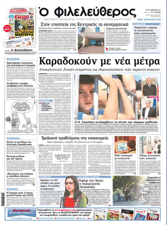 “Ο Φιλελεύθερος” υπό τον τίτλο “Καραδοκούν με νέα μέτρα” γράφει πως ετοιμότητα για λήψη «επιπλέον δυνητικών μέτρων» πέραν αυτών που περιλαμβάνονται στο προσχέδιο του κυπριακού μνημονίου, με φόντο τις ιδιωτικοποιήσεις, αναμένεται σύμφωνα με πληροφορίες της εφημερίδας να ζητηθεί από τη Λευκωσία, στο πλαίσιο της αποψινής συνεδρίας του Eurogroup. Αλλού γράφει ότι σοβαρά προβλήματα θα δημιουργηθούν στα κρατικά νοσηλευτήρια εάν το νέο ωράριο λειτουργίας τους εφαρμοστεί χωρίς να ληφθούν άλλα απαραίτητα μέτρα. Σε άλλο θέμα γράφει ότι η Άγκυρα έχει προχωρήσει και διεξάγει έρευνα από ειδικούς στα θέματα των περιουσιών, η οποία αφορά τη χαρτογράφηση περιουσιών γενικά αλλά και εδικά σε κατηγορίες, δηλαδή σε ποιον ανήκει, ε/κ ή τ/κ, χαλίτικη γη, Εκκλησία, ΕΒΚΑΦ.
