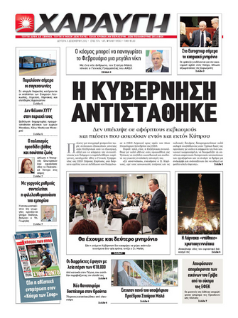 Η “Χαραυγή” υπό τον τίτλο “Η Κυβέρνηση αντιστάθηκε” γράφει ότι πιέσεις για υπογραφή μνημονίου χωρίς αντίσταση εξασκούσαν συνεχώς στην Κυβέρνηση από το εξωτερικό, αλλά και τα κόμματα της αντιπολίτευση και διάφοροι νεοφιλελεύθεροι παράγοντες, κατήγγειλε χθες ο ΓΓ της ΠΕΟ Πάμπης Κυρίτσης. Σε άλλο θέμα γράφει ότι στο Eurogroup συζητείται σήμερα το κυπριακό μνημόνιο και ότι αξιωματούχος της Ευρωζώνης δήλωσε ότι οι τράπεζες ευθύνονται για την οικονομική κρίση στην Κύπρο. Αλλού γράφει ότι εκδήλωση διαμαρτυρίας πραγματοποίησαν χθες κάτοικοι των χωριών Μενοίκου, Κάτω Μονής και Μιτσερού, οι οποίοι διαμαρτύρονται στην ανέγερση εργοστασίου διαχείρισης οικιακών αποβλήτων στην περιοχή τους για την επαρχία Λευκωσίας.
