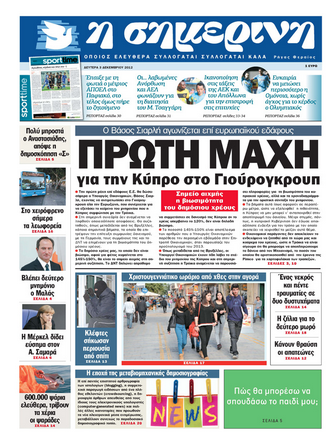 “Η Σημερινή” υπό τον τίτλο “Πρώτη μάχη για την Κύπρο στο Γιούρογκρουπ” γράφει ότι την πρώτη μάχη επί εδάφους ΕΕ θα δώσει σήμερα ο Υπουργός Οικονομικών, Βάσος Σιαρλή, έχοντας να αντιμετωπίσει στο Γιούρογκρουπ όλη την Ευρωζώνη, που συνέρχεται για να εξετάσει το κείμενο το μνημονίου που η Κύπρος συμφώνησε με την Τρόικα. Σε άλλο θέμα γράφει ότι με βάση τις τελευταίες δημοσκοπήσεις για τις Προεδρικές πολύ μπροστά εμφανίζεται ο Νίκος Αναστασιάδης, ενώ απόψε το «Σίγμα» θα παρουσιάσει μεγάλη δημοσκόπηση για τις Προεδρικές. Αλλού γράφει ότι ο υποψήφιος Πρόεδρος Σταύρος Μαλάς, βλέπει δεύτερο μνημόνιο, ενώ ο Γιώργος Λιλλήκας μιλά για ασάφειες του μνημονίου στον τομέα της υγείας που θέτουν σε κίνδυνο ακόμα και ανθρώπινες ζωές.