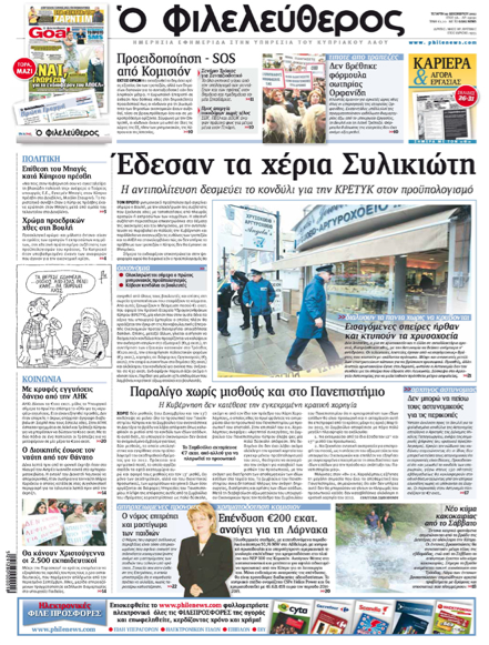 «Ο Φιλελεύθερος» στο κύριο του θέμα με τίτλο «Εδεσαν τα χέρια Συλικιώτη» αναφέρει πως στον πρώτο μνημονιακό προϋπολογισμό που εγκρίνει σήμερα η Βουλή η αντιπολίτευση δεσμεύει το κονδύλι για την Κρατική Εταιρεία Υδρογονανθράκων Κύπρου (ΚΡΕΤΥΚ). Αλλού αναφέρει πως χωρίς δυο μισθούς (του Δεκεμβρίου και τον 13ο) κινδύνεψε να μείνει όλο το προσωπικό του Πανεπιστημίου Κύπρου και το Συμβούλιό του αναγκάστηκε τη Δευτέρα το βράδυ να λάβει απόφαση όπως καλυφθούν οι μισθοί από το κονδύλι των ίδιων εσόδων. Σε άλλο θέμα γράφει ότι επένδυση 200 εκ. ευρώ ανοίγει για τη Λάρνακα με χρηματοδότηση Κομισιόν. Πρόκειται για ηλιοθερμικό σταθμό, με κατευθυνόμενα παραβολικά κάτοπτρα 50,76 MW στο Αβδελλερό.