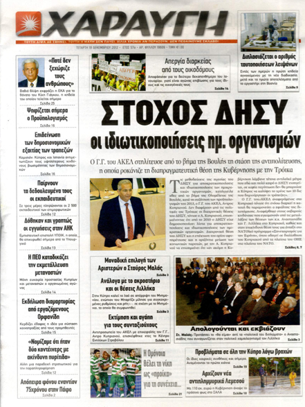 Η «Χαραυγή» με κύριο τίτλο «Στόχος ΔΗΣΥ οι ιδιωτικοποιήσεις ημ. οργανισμών» αναφέρει πως ο ΓΓ του ΑΚΕΛ Αντρος Κυπριανού κατήγγειλε από το βήμα της Ολομέλειας της Βουλής τις μεθοδεύσεις της ηγεσίας του ΔΗΣΥ για αποκρατικοποιήσεις και ιδιωτικοποιήσεις των ημικρατικών οργανισμών. Αλλού σημειώνει πως απεργία διαρκείας αποφάσισαν για το δεύτερο δεκαπενθήμερο του Ιανουαρίου οι οικοδόμοι. Εξάλλου αναφέρει πως προβλήματα υπήρξαν σε όλη την Κύπρο, λόγω των βροχών. Οι ίδιες καιρικές συνθήκες θα επικρατήσουν και σήμερα ενώ αναμένονται τα πρώτα χιόνια.