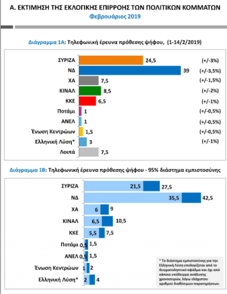 Σύμφωνα με την Public Issue, στην εκλογική επιρροή η ΝΔ συγκεντρώνει ποσοστό 39% έναντι 24,5% του ΣΥΡΙΖΑ ενώ στην τρίτη θέση βρίσκεται το Κίνημα Αλλαγής με 8,5%. Ακολουθούν Χρυσή Αυγή με 7,5%, ΚΚΕ με 6,5%, Ελληνική Λύση στο 3%, Ένωση Κεντρώων με 1,5%, Ποτάμι και ΑΝΕΛ με 1%.