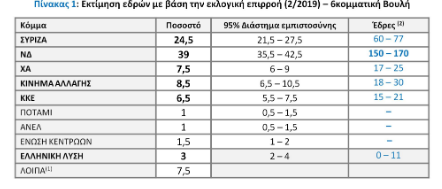 Σύμφωνα με την ανάλυση της εταιρείας για τα αποτελέσματα της έρευνας, η τρέχουσα μέτρηση επιβεβαιώνει την εκτίμηση, ότι η ΝΔ έχει σταθεροποιήσει την εκλογική της επιρροή, η οποία καταγράφεται σήμερα στο 39% , ενώ διατηρεί ταυτόχρονα και ανοικτό προβάδισμα 14,5 εκατοστιαίων μονάδων, έναντι του ΣΥΡΙΖΑ.