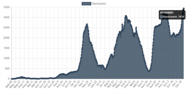 Παράλληλα, τις τελευταίες ημέρες καταγράφεται πολύ υψηλό επιδημιολογικό φορτίο και χθες ανακοινώθηκε «έκρηξη» κρουσμάτων με 4.165 νέες μολύνσεις. Αξίζει να σημειωθεί πως σύμφωνα με τον μ.ο. κρουσμάτων ανά εβδομάδα, το τελευταίο 7ήμερο καταγράφεται ο υψηλότερος αριθμός νέων μολύνσεων από την αρχή της πανδημίας.