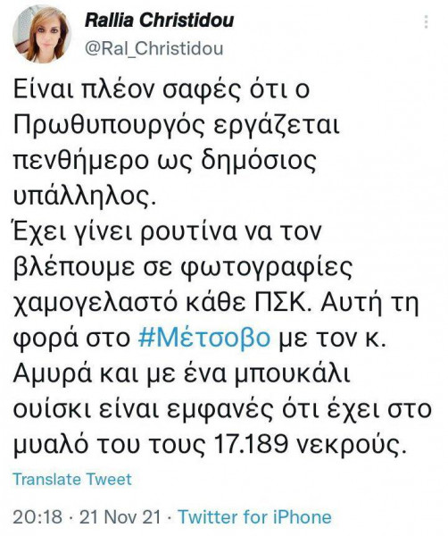 «Είναι πλέον σαφές ότι ο Πρωθυπουργός εργάζεται πενθήμερο ως δημόσιος υπάλληλος. ‘Εχει γίνει ρουτίνα να τον βλέπουμε σε φωτογραφίες χαμογελαστό κάθε ΠΣΚ. Αυτή τη φορά στο Μέτσοβο με τον κ. Αμυρά και με ένα μπουκάλι ουίσκι είναι εμφανές ότι έχει στο μυαλό του τους 17.189 νεκρούς», έγραψε η κ. Χρηστίδου.