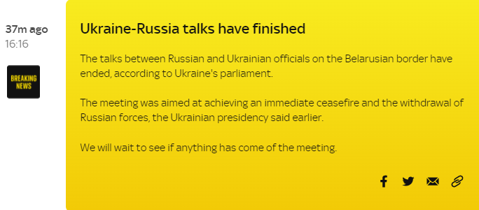 Νωρίτερα, τόσο η ουκρανική ιστοσελίδα Nexta, όσο και διεθνή ΜΜΕ, όπως το Sky News, μετέδιδαν ότι οι συζητήσεις των δύο πλευρών ολοκληρώθηκαν, ωστόσο, όπως φαίνεται αυτό δεν ισχύει.