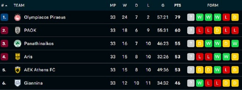 Οι Ερυθρόλευκοι ανέβηκαν στους 79 πόντους και είναι στο +19 από τον δεύτερο ΠΑΟΚ, ενώ οι «κιτρινόμαυροι» έμειναν στους 53 και είναι ισόβαθμοι με την ΑΕΚ στην 4η θέση.