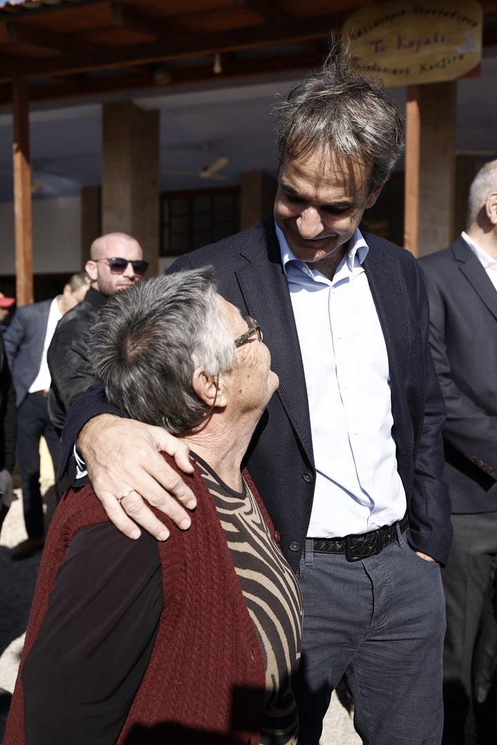 Τελευταίος σταθμός της επίσκεψης του Πρωθυπουργού ήταν το χωριό Άμπελος, όπου είχε την ευκαιρία να συναντήσει, να ανταλλάξει ευχές και να συζητήσει με την κυρία Χριστίνη, μία εκ των γηραιότερων μόνιμων κατοίκων του νησιού.