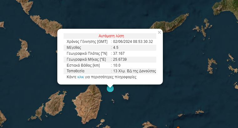 Ο σεισμός ήταν μεγέθους 4,5 Ρίχτερ, με επίκεντρο στο Αιγαίο και συγκεκριμένα 13 χλμ, βορειοδυτικά της Δονούσας, στις Κυκλάδες.