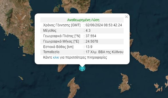 Σύμφωνα με το Γεωδυναμικό Ινστιτούτου, το επίκεντρο του σεισμού βρίσκεται στα 17 χλμ βόρεια βορειοανατολικά της Κύθνου και το εστιακό του βάθος στα 14 χλμ.