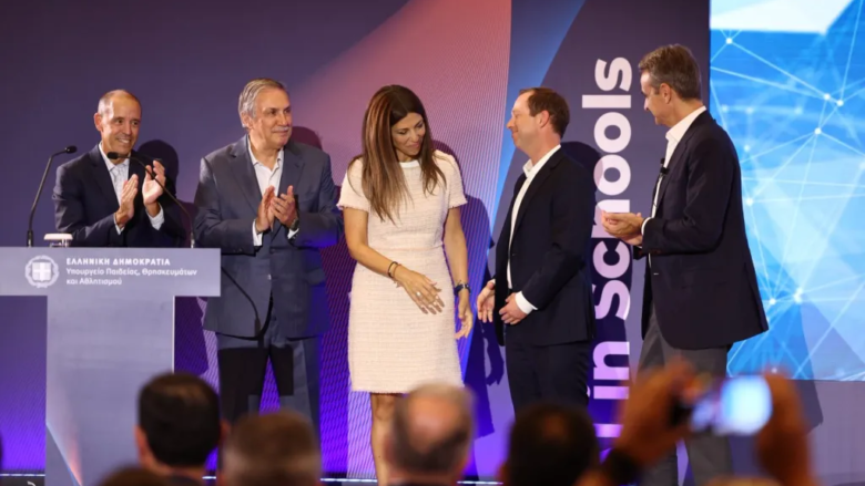 Φωτό: O πρωθυπουργός Κυριάκος Μητσοτάκης (Δ), η υπουργός Παιδείας, Θρησκευμάτων και Αθλητισμού Σοφία Ζαχαράκη (2Δ) και ο πρόεδρος του Ιδρύματος Ωνάση Αντώνης Παπαδημητρίου (2Α) παρίστανται στην εκδήλωση για την παρουσίαση της συνεργασίας της ελληνικής κυβέρνησης με την OpenAI με θέμα: “All in school: Η τεχνητή νοημοσύνη στην εκπαίδευση” με την υποστήριξη του “Onassis Fountation” και σε συνεργασία Open AI.