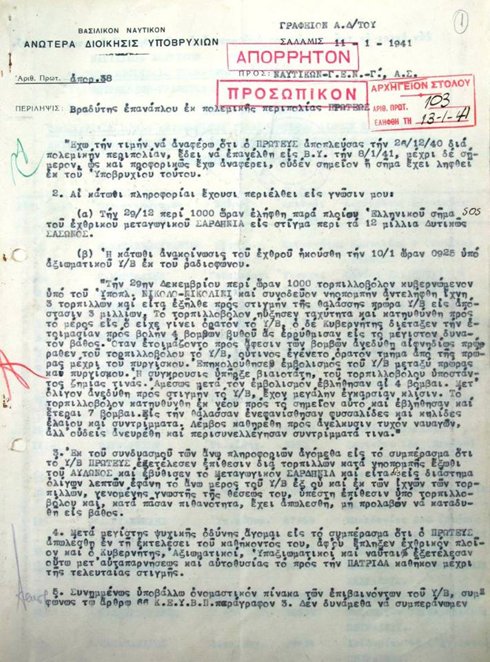 Το υποβρύχιο «Πρωτεύς» ήταν η πρώτη απώλεια του πολεμικού μας ναυτικού από την έναρξη του πολέμου ενάντια στο φασιστικό άξονα.