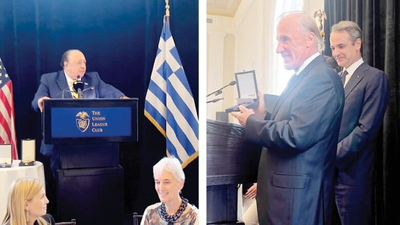 Ο Πρωθυπουργός Κυριάκος Μητσοτάκης τίμησε, μεταξύ άλλων, τον παλαίμαχο δημοσιογράφο και συγγραφέα, Νικόλαο Γκαντζογιάννη, στην εκδήλωση που έλαβε χώρα στο Union League Club. ΦΩΤΟΓΡΑΦΙΑ: «ΕΘΝΙΚΟΣ ΚΗΡΥΞ»/ΧΡΙΣΤΟΔΟΥΛΟΣ ΑΘΑΝΑΣΑΤΟΣ