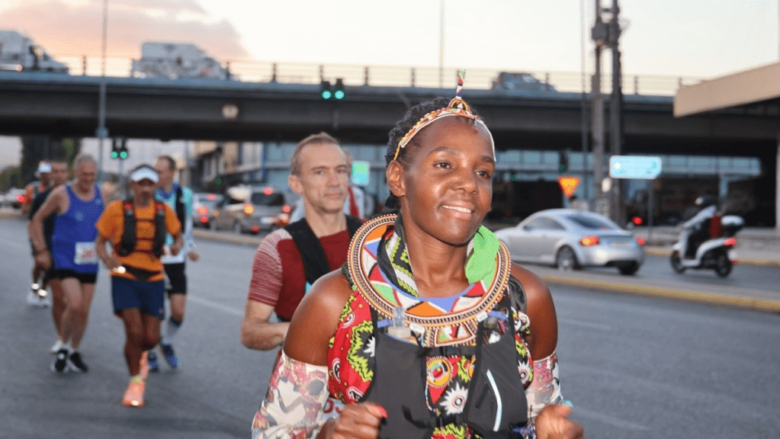 Η 42χρονη υπεραμαραθωνοδρόμος, που ζει στη Γερμανία, πήρε μέρος για 2η φορά στον αγώνα, τρέχοντας με σανδάλια και φορώντας παραδοσιακή στολή της φυλής των Μασάι.