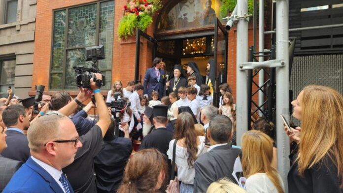 Οι μαθητές και οι δάσκαλοι σε μια αναμνηστική φωτογραφία με τον Οικουμενικό Πατριάρχη, κ. Βαρθολομαίο και τον Αρχιεπίσκοπο Αμερικής, κ. Ελπιδοφόρο στην είσοδο του ναού του Αγίου Γεωργίου του Τροπαιοφόρου στο Μανχάταν.