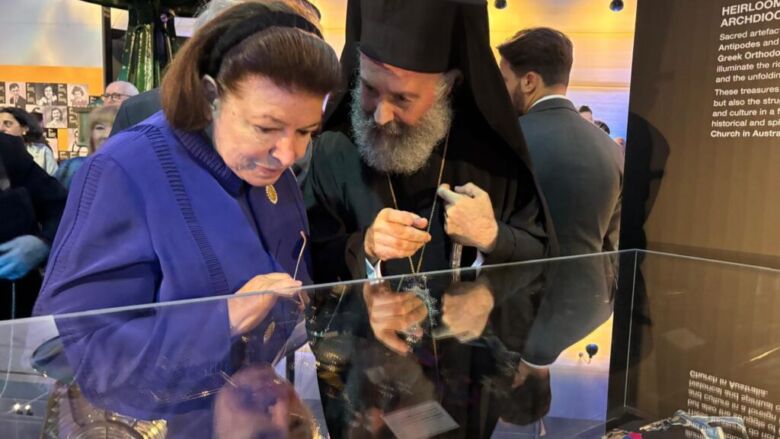 Στη συνέχεια έγινε η παρουσίαση της έκθεσης, στην παρακείμενη αίθουσα, με πολύτιμα τεκμήρια της ορθόδοξης παράδοσης της ελληνικής παρουσίας στην Αυστραλία, και με πλούσιο φωτογραφικό υλικό.