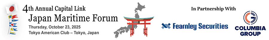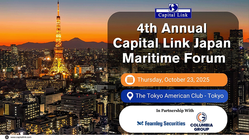 Η Capital Link φιλοξενεί το 4ο Ετήσιο Ναυτιλιακό Φόρουμ της Capital Link Japan την Πέμπτη, 23 Οκτωβρίου 2025, στο Tokyo American Club στο Τόκιο της Ιαπωνίας. Το Φόρουμ πραγματοποιείται σε συνεργασία με την Fearnley Securities και την Columbia Shipmanagement. Αυτή η εκδήλωση διερευνά ευκαιρίες επιχειρηματικής ανάπτυξης που συνδέουν ηγέτες από τη διεθνή και ιαπωνική ναυτιλιακή, χρηματοοικονομική, ναυπηγική και εμπορική κοινότητα. Το Φόρουμ παρέχει ευκαιρίες δικτύωσης με μεγάλες τράπεζες, εταιρείες χρηματοδοτικής μίσθωσης, ναυπηγεία, εμπορικούς οίκους και συμμετέχοντες στον κλάδο.