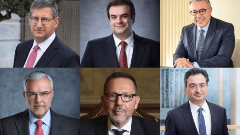 Πάνω: Παύλος Μυλωνάς (CEO Εθνικής Τράπεζας) Κυριάκος Πιερρακάκης (Υπ. Οικονομικών), Βασίλης Ψάλτης (CEO Alpha Bank). Κάτω: Χρήστος Μεγάλου (CEO Τράπεζας Πειραιώς), Γιάννης Στουρνάρας (Διοικητής ΤτΕ), Φωκίων Καραβίας (CEO Eurobank)
