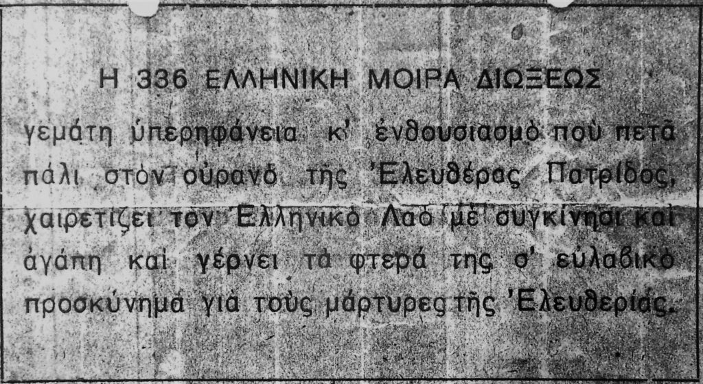 Τον Οκτώβριο του 1943 η 336 Μοίρα θα εξοπλιστεί με τα πρώτα έξι Σπιτφάιρ. Έναν μήνα αργότερα ο μοίραρχος Σπύρος Διαμαντόπουλος θα καταρριφθεί σε αποστολή στην Κρήτη, θα αιχμαλωτιστεί αλλά θα επιβιώσει για να επιστρέψει στην Ελλάδα με το τέλος του πολέμου.Τον Σεπτέμβριο του 1944 η 336η Μοίρα μετακινείται στην Ιταλία, στο ευρωπαϊκό θέατρο των επιχειρήσεων και μαζί με την 335η θα εκτελούν αποστολές προσβολής των υποχωρούντων Γερμανών έως και τις γιουγκοσλαβικές ακτές. Στις 12 Οκτωβρίου 1944 ανήμερα της απελευθέρωσης της Αθήνας από τον ναζιστικό ζυγό, θα σκοτωθεί και ο σμηναγός Επαμεινώνδας Κοττάς σε διατεταγμένη επιχείρηση και είναι ο τελευταίος νεκρός αεροπόρος σε αεροπορικές επιχειρήσεις στο εξωτερικό, πριν και οι τρεις μοίρες επιστρέψουν στην Ελλάδα και προσγειωθούν στο τότε Χασάνι (σ.σ. Ελληνικό) στις 14 Νοεμβρίου 1944.