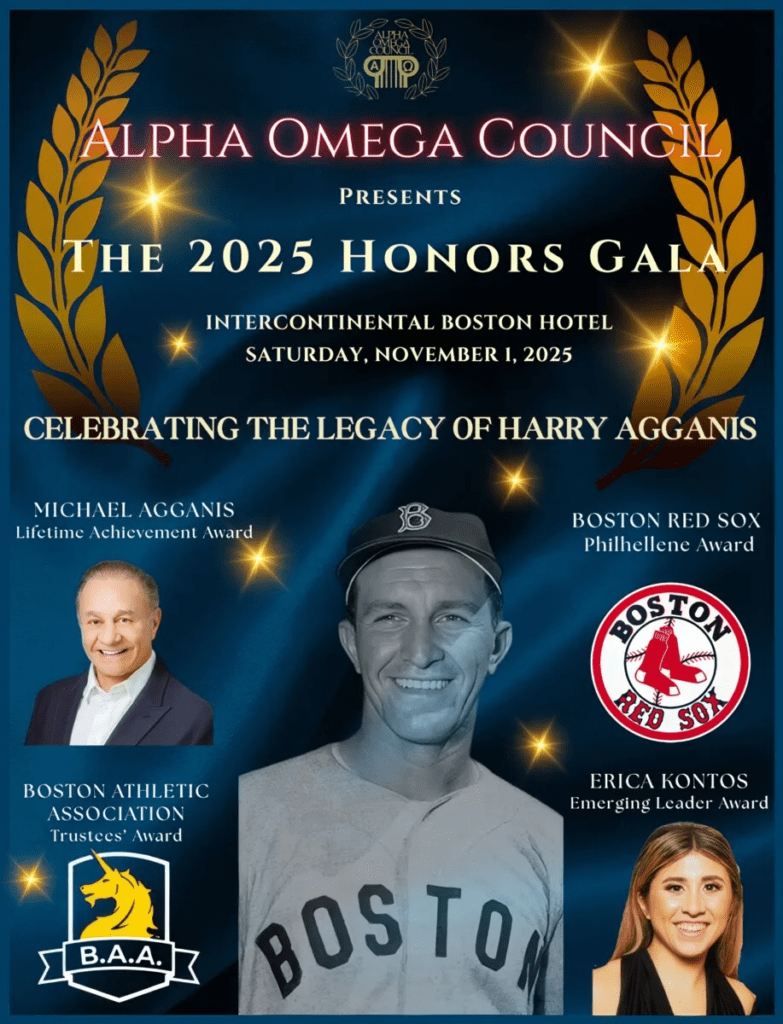 Το Gala του Συμβουλίου Alpha Omega 2025, που θα πραγματοποιηθεί το Σάββατο, 1 Νοεμβρίου, στο InterContinental Hotel, θα απονείμει το περίβλεπτο Βραβείο Επίτευξης Ζωής στον Michael J. Agganis, ανιψιό του «Χρυσού Έλληνα», Harry Agganis (κεντρική φωτό).