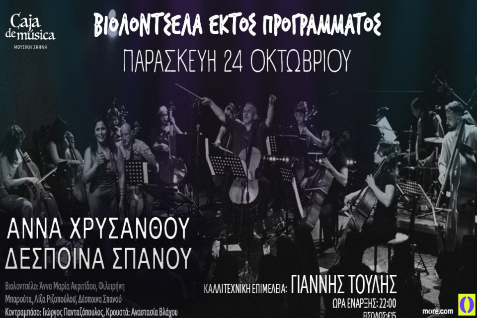Την Παρασκευή που μας πέρασε, 24 Οκτωβρίου, στη Μουσική Σκηνή Caja de Musica το κοινό της Αθήνας είχε την ευκαιρία να απολαύσει μία πρωτότυπη μουσική παράσταση, με τίτλο «Βιολοντσέλα εκτός προγράμματος», όπου ερμηνεύθηκαν ελληνικά τραγούδια με ιδιαίτερη οπτική, χρησιμοποιώντας πέντε βιολοντσέλα, ένα κοντραμπάσο και κρουστά.