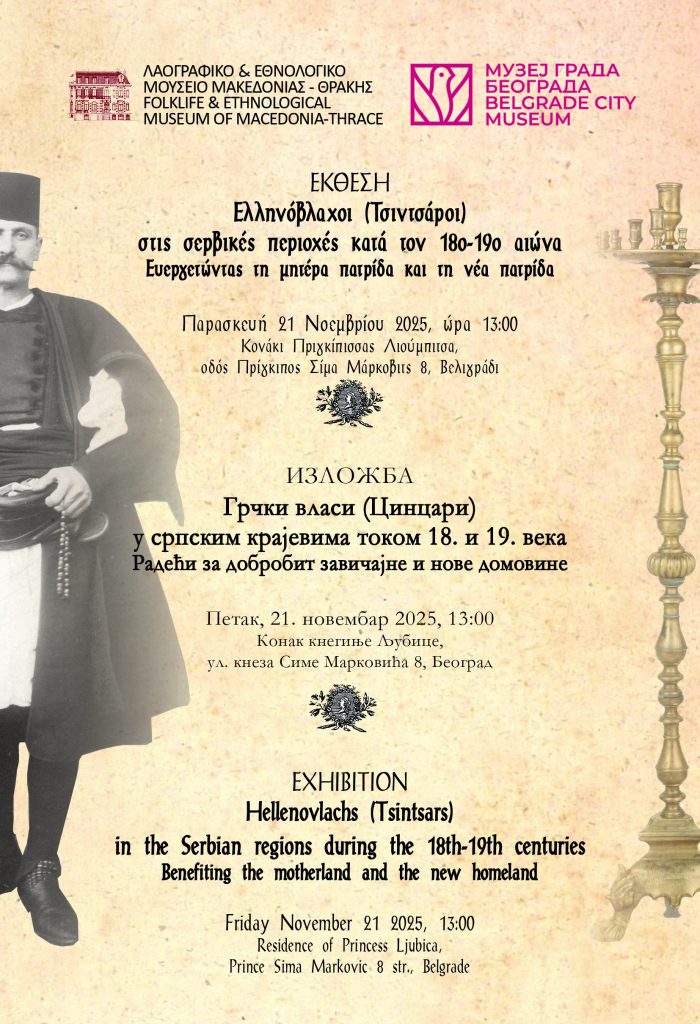 Η έκθεση «Ελληνόβλαχοι (Τσιντσάροι) στις σερβικές περιοχές κατά τον 18ο-19ο αιώνα. Ευεργετώντας τη μητέρα πατρίδα και τη νέα πατρίδα» εγκαινιάζεται την Παρασκευή 21 Νοεμβρίου 2025, ώρα 13:00 στο Κονάκι Πριγκίπισσας Λιούμπιτσα, οδός Πρίγκιπος Σίμα Μάρκοβιτς 8, Βελιγράδι.