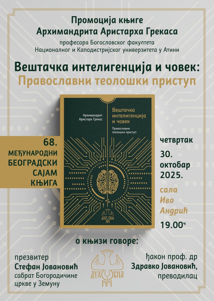 Ο εκδοτικός οίκος της Αρχιεπισκοπής Βελιγραδίου-Κάρλοβατς, με χαρά ενημερώνει τους αναγνώστες του ότι κυκλοφόρησε μια νέα έκδοση — μια μετάφραση της μελέτης του Αρχιμανδρίτη Αρίσταρχου Γκρέκα, καθηγητή της Θεολογικής Σχολής του Εθνικού και Καποδιστριακού Πανεπιστημίου Αθηνών, σχετικά με την ορθόδοξη στάση απέναντι στο φαινόμενο της τεχνητής νοημοσύνης.