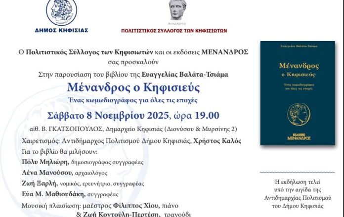 Παρουσίαση του βιβλίου “Μένανδρος ο Κηφισιεύς – Ένας κωμωδιογράφος για όλες τις εποχές”