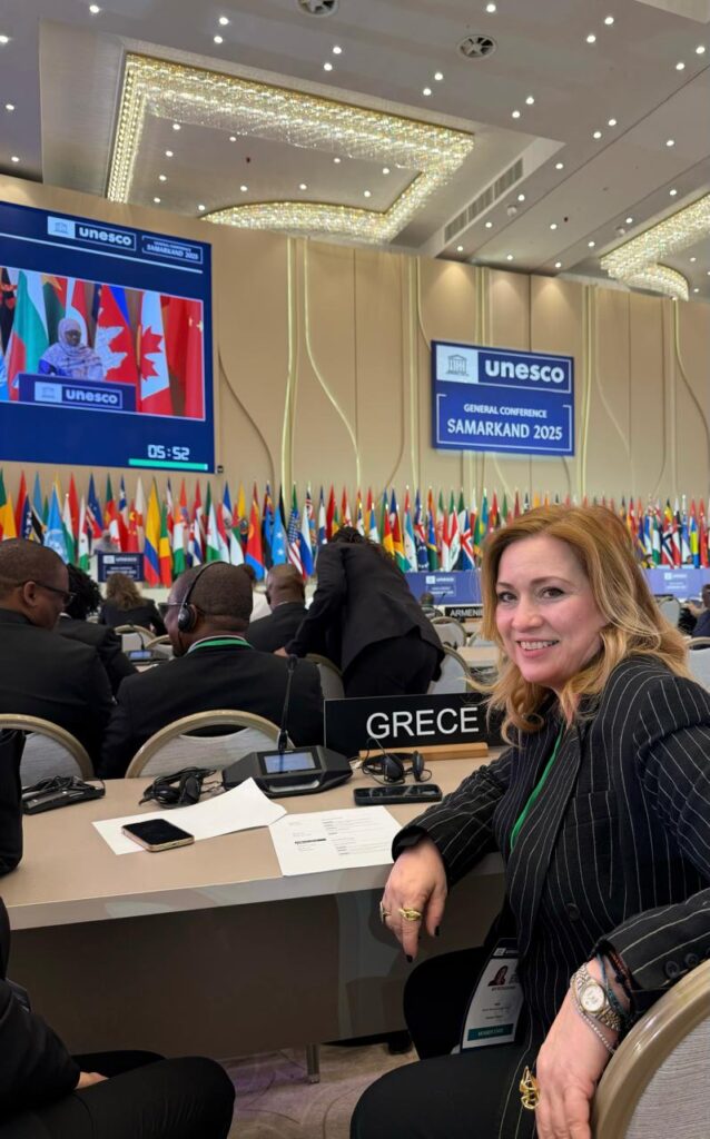 Η Γεν. Γραμμ. Απόδημου Ελληνισμού και Δημόσιας Διπλωματίας του ΥΠΕΞ, Μάιρα Μυρογιάννη, πήγε στη Σαμαρκάνδη του Ουζμπεκιστάν στις 3-5 Νοεμβρίου 2025, συμμετέχοντας στην επίσημη Ελληνική Αντιπροσωπεία στην 43η Γενική Διάσκεψη της UNESCO, στην οποία επικυρώθηκε η απόφαση ανακήρυξης της 9ης Φεβρουαρίου ως Παγκόσμιας Ημέρας Ελληνικής Γλώσσας.