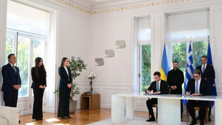 Η υπογραφή της συμφωνίας έγινε παρουσία του Κυριάκου Μητσοτάκη, του Βολοντίμιρ Ζελένσκι και της Κίμπερλι Γκίλφοϊλ, στο Μέγαρο Μαξίμου.