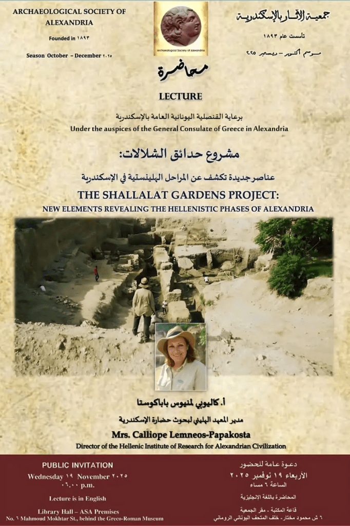 Αλεξάνδρεια.– Την Τετάρτη 19 Νοεμβρίου 2025, η αρχαιολόγος και Διευθύντρια του Ελληνικού Ινστιτούτου-Ιδρύματος Αλεξανδρινού Πολιτισμού κα Καλλιόπη Παπακώστα, θα δώσει διάλεξη στην Αρχαιολογική Εταιρεία Αλεξανδρείας με θέμα την σημαντικότητα των ελληνιστικών ευρημάτων που ανακαλύπτει μέσα από τις πολύχρονες έρευνές της στον Κήπο Ελ Σαλαλάτ.