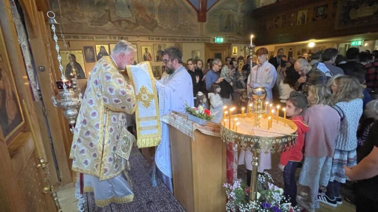 Ο πρωτοπρεσβύτερος Κωνσταντίνος Κενανίδης τοποθετεί το ωμοφόριο στον Μητροπολίτη Βελγίου Αθηναγόρα κατά την Λειτουργία την Κυριακή 16 Νοεμβρίου.