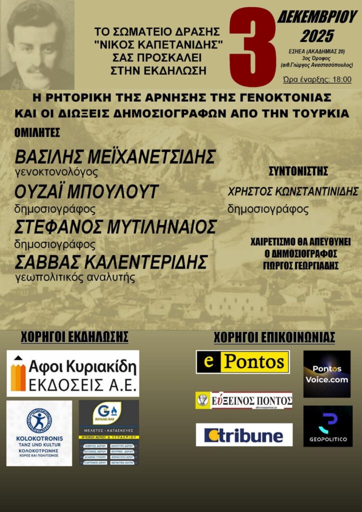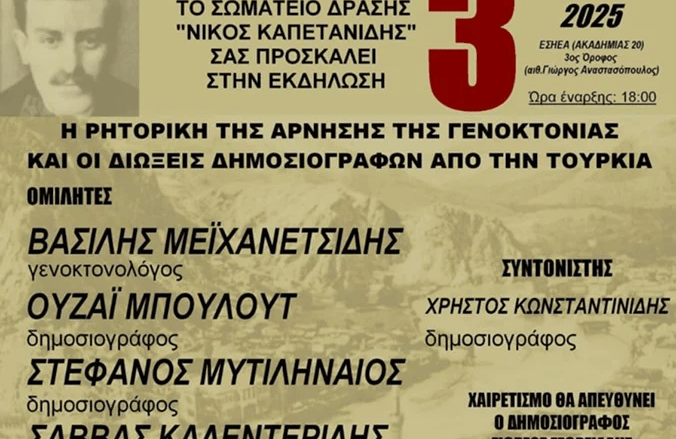 Το Σωματείο Δράσης «Νίκος Καπετανίδης» σας προσκαλεί την Τετάρτη 3 Δεκεμβρίου 2025, στις 18.00, στην ΕΣΗΕΑ (Ακαδημίας 20), 3ος όροφος, (αίθουσα Γεώργιος Αναστασόπουλος) στην εκδήλωση με θέμα:
