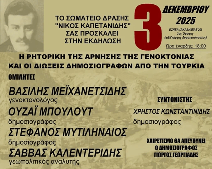 Το Σωματείο Δράσης «Νίκος Καπετανίδης» σας προσκαλεί την Τετάρτη 3 Δεκεμβρίου 2025, στις 18.00, στην ΕΣΗΕΑ (Ακαδημίας 20), 3ος όροφος, (αίθουσα Γεώργιος Αναστασόπουλος) στην εκδήλωση με θέμα:
