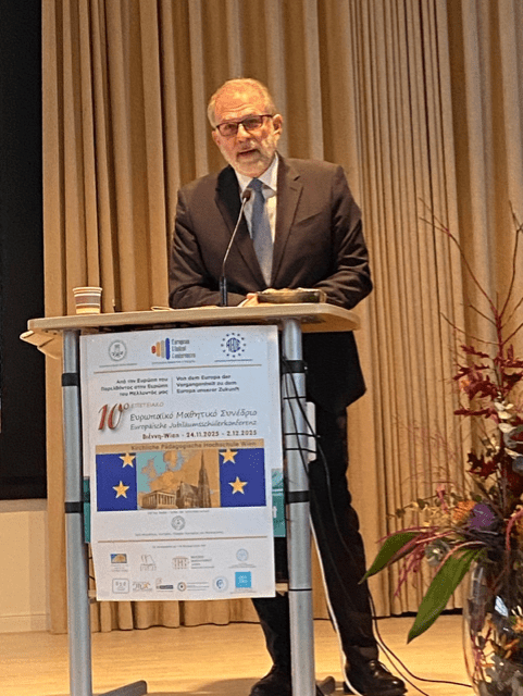 Βιέννη.- Παρουσία του κ. Θεόδωρου Ρουσσοπούλου, προέδρου του Ευρωπαϊκού Κοινοβουλίου, του πρέσβη της Ελλάδας στην Αυστρία κυρίου Γεωργίου Ηλιόπουλου, της πρέσβεως της Ομοσπονδιακής Ομοσπονδίας της Αυστρίας κας Gerda Vogel, της κοινοβουλευτικής ομάδας ελληνο-αυστριακής φιλίας με επικεφαλής τον κοινοβουλευτικό εκπρόσωπο του Σοσιαλιστικού κόμματος της Αυστρίας κύριον Wolfgang Kocevor, τελέστηκε Τρίτη 25 Νοεμβρίου 2025 στο Kirchliche Pädagogische HochschuleWien/Niederösterreich ( μέγαρο της εκκλησιαστικής παιδαγωγικής ανωτέρα σχολής Βιέννης/Κατω Αυστρίας) η επίσημη τελετή έναρξης του 10ου Επετειακού Ευρωπαϊκού Μαθητικού Συνεδρίου, με τίτλο «Από την Ευρώπη του Παρελθόντος στην Ευρώπη του Μέλλοντός μας».