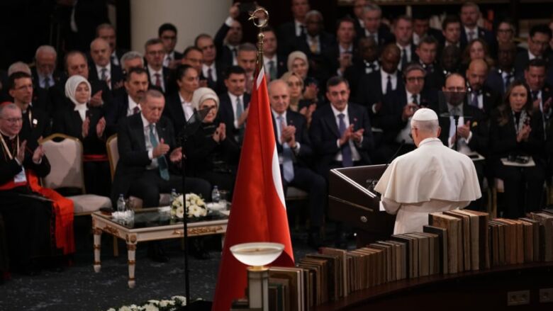 «Μπορεί η Τουρκία να είναι ένας παράγοντας σταθερότητας και προσέγγισης ανάμεσα στους λαούς στην υπηρεσία μίας δίκαιης και βιώσιμης ειρήνης», δήλωσε ο πάπας τονίζοντας ότι η χώρα αποτελεί επίσης «ένα σταυροδρόμι ευαισθησιών η ομογενοποίηση των οποίων συνιστά εκπτώχυνση».