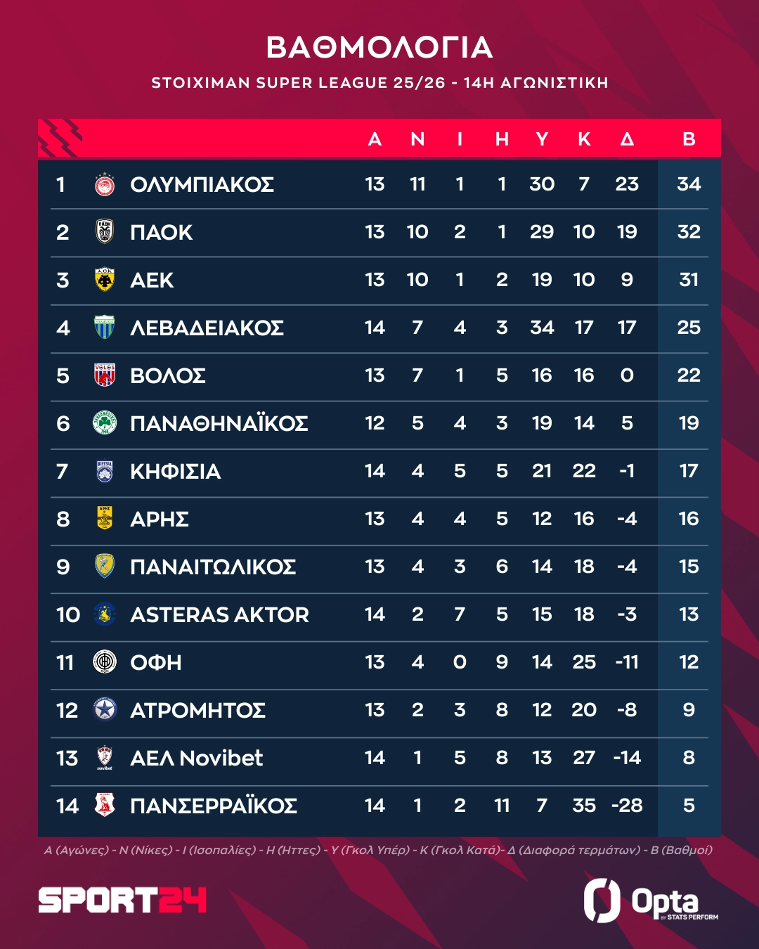 Το πρόγραμμα και τα αποτελέσματα της 14ης αγωνιστικής