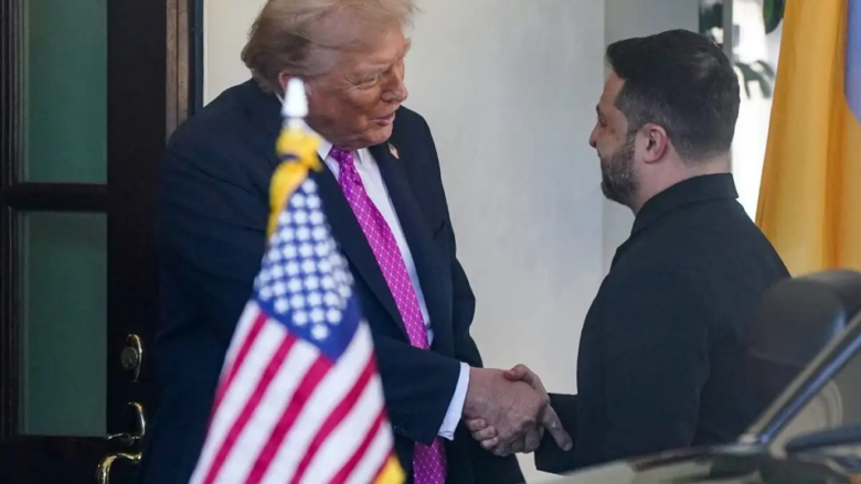 Ο Πρόεδρος των ΗΠΑ Ντόναλντ Τραμπ (αριστερά) υποδέχεται τον Ουκρανό Πρόεδρο Βολοντίμιρ Ζελένσκι κατά την άφιξή του στον Λευκό Οίκο, 17 Οκτωβρίου 2025