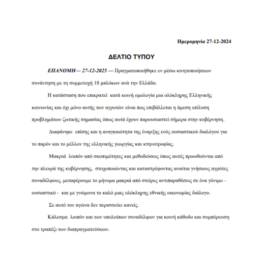 Ταυτόχρονα, επισημαίνεται η ανάγκη για έναν ουσιαστικό και παραγωγικό διάλογο, με τους συμμετέχοντες να ξεκαθαρίζουν ότι απορρίπτουν «σκοπιμότητες και μεθοδεύσεις» οι οποίες, όπως αναφέρουν, προέρχονται από κυβερνητικής πλευράς. Στην ίδια ανακοίνωση γίνεται λόγος για στοχοποίηση και «αναίτια καταστροφή γνήσιων αγροτών συναδέλφων», ενώ διατυπώνεται η άποψη ότι ο διάλογος οφείλει να διεξαχθεί χωρίς στείρες συγκρούσεις και με γνώμονα το συμφέρον της εθνικής οικονομίας.