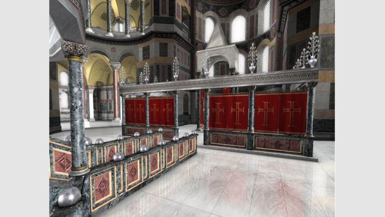 «Το ιερό… Ο χώρος αυτός είναι εντελώς απρόσιτος στους άλλους εξόν των ιερέων. Τον ονομάζουν και θυσιαστήριο. Είναι καλυμμένος με σαράντα χιλιάδες λίτρα ασήμι!» γράφει ο Προκόπιος προσπαθώντας να αποδώσει μία εικόνα, που δεν χωράει στα μάτια του… «Θα νόμιζε κανείς ότι έχει βρεθεί σε πανέμορφο ολάνθιστο κήπο […] θα μπορούσε να θαυμάσει κανείς το χρώμα της πορφύρας… της χλόης… το βαθύ κόκκινο που απλώνεται στις επιφάνειες ή και το λευκό που αστράφτει περισσότερο… Όταν κάποιος έρχεται στο ιερό για να προσευχηθεί, συνειδητοποιεί αμέσως ότι το έργο τούτο δεν έγινε τόσο τέλειο ούτε από τη δύναμη, ούτε από την τέχνη των ανθρώπων, αλλά από θεϊκή επενέργεια· ο νους του μετουσιώνεται και κατευθύνεται προς τον Θεό και νομίζει ότι ο Θεός δεν είναι μακριά, αλλά ότι έχει τρυπώσει χωρίς να γίνη αντιληπτός ανάμεσα σ΄ εκείνους που διάλεξε».