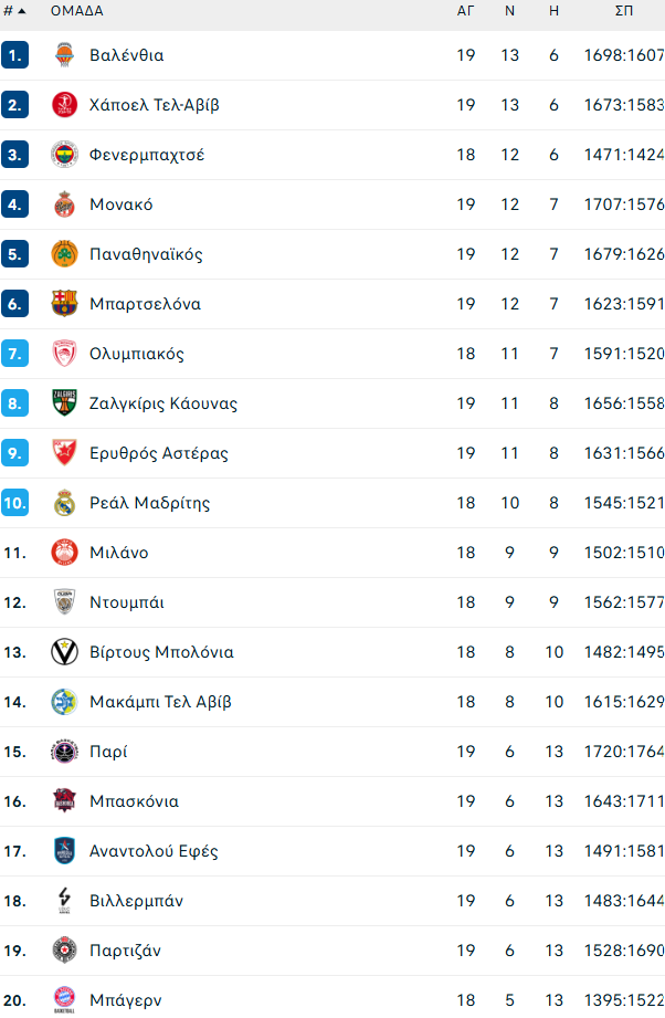 Τα αποτελέσματα της 19ης αγωνιστικής στη Euroleague: