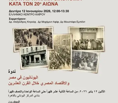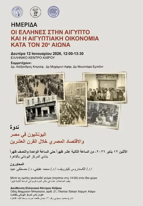 Τη Δευτέρα 12 Ιανουαρίου 2026, στο Ελληνικό Κέντρο Καΐρου, θα πραγματοποιηθεί επιστημονική ημερίδα με θέμα «Οι Έλληνες στην Αίγυπτο και η αιγυπτιακή οικονομία κατά τον 20ό αιώνα». Η εκδήλωση φιλοδοξεί να αναδείξει τον πολυσχιδή ρόλο της ελληνικής παροικίας στην οικονομική, κοινωνική και πολιτισμική ζωή της Αιγύπτου, εστιάζοντας στις αλληλεπιδράσεις μεταξύ ελληνικής παρουσίας και αιγυπτιακής οικονομικής ανάπτυξης κατά τον περασμένο αιώνα.