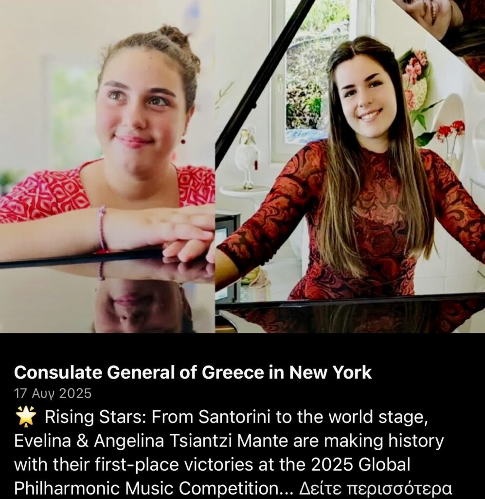 Σαντορίνη.- Το 2025 αποτέλεσε χρονιά–ορόσημο για τις δύο χαρισματικές νεαρές πιανίστριες, την Εβελίνα και την Αγγελίνα Τσιαντζή Μαντέ από τη Σαντορίνη, οι οποίες χάραξαν μια εκπληκτική πορεία που ξεπέρασε σύνορα και προσδοκίες και άφησαν το αποτύπωμά τους τόσο στην Ευρώπη όσο και την Αμερική. Ήταν μία χρονιά γεμάτη λαμπερές εμφανίσεις σε ιστορικές αίθουσες συναυλιών, σημαντικότατες διεθνείς διακρίσεις και καθοριστικά ακαδημαϊκά και καλλιτεχνικά βήματα, μέσω των οποίων οι δύο νεαρές καλλιτέχνιδες επιβεβαίωσαν ότι το ταλέντο, όταν συναντά την αφοσίωση και τη βαθιά μουσική καλλιέργεια, μπορεί να οδηγήσει σε εκπληκτικά αποτελέσματα. Τα ονόματά τους αναφέρθηκαν και συζητήθηκαν σε ακαδημαϊκούς κύκλους, σε συναυλιακά προγράμματα υψηλών απαιτήσεων, αλλά και σε μέσα ενημέρωσης στην Ελλάδα, την Ευρώπη και τις Ηνωμένες Πολιτείες Αμερικής, επιβεβαιώνοντας τη δυναμική παρουσία τους στη νέα γενιά της πιανιστικής τέχνης.