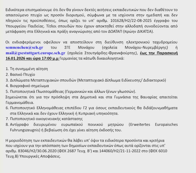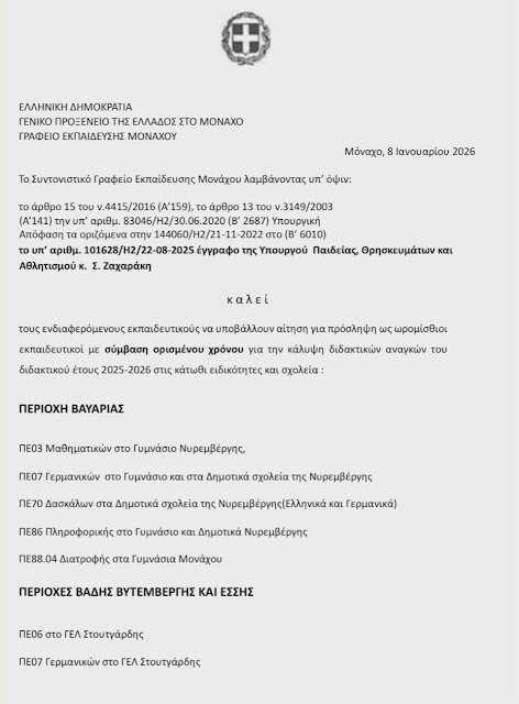 Μόναχο.- Το Συντονιστικό Γραφείο Εκπαίδευσης Μονάχου καλεί ενδιαφερόμενους εκπαιδευτικούς για την κάλυψη διδακτικών αναγκών του έτους 2025-2026.