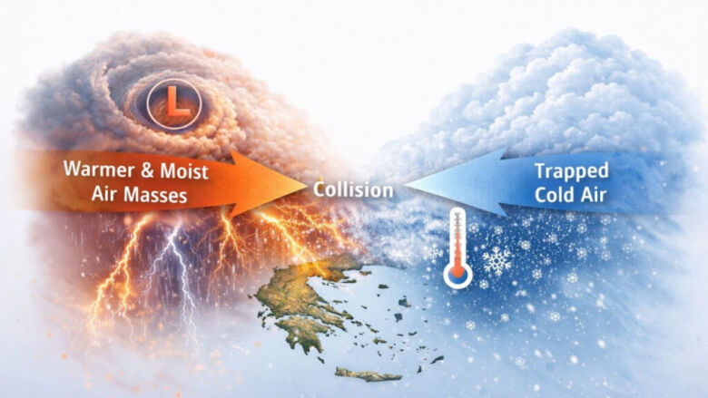 Σε χειμερινούς ρυθμούς με αρκετό κρύο θα κυλήσει το επόμενο διήμερο, ωστόσο από την Τρίτη, αναμένεται μία αλλαγή του καιρού, με έντονα φαινόμενα, η οποία οφείλεται σε ένα φαινόμενο, που δεν εμφανίζεται συχνά και αφορά στη «συνάντηση» της υγρασίας με το εγκλωβισμένο ψύχος.