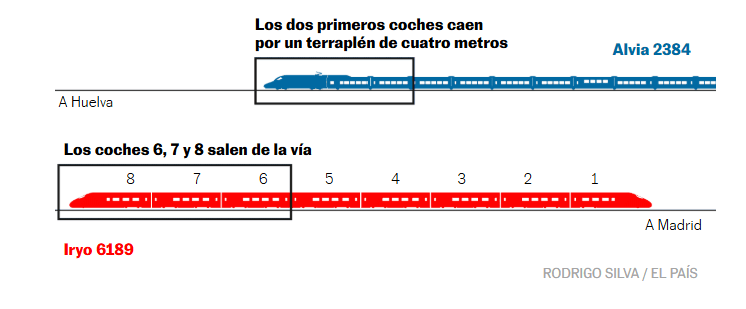 Τα δύο πρώτα βαγόνια του τρένου Άλβια (μπλε χρώμα) εκσφενδονίστηκαν μετά τη σύγκρουσή τους με τα τελευταία τρία βαγόνια του Iryo (κόκκινο χρώμα) τα οποία εκτροχιάστηκαν νωρίτερα και πέρασαν στην παρακείμενη γραμμή
