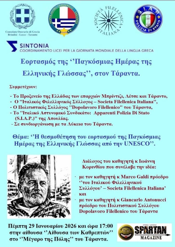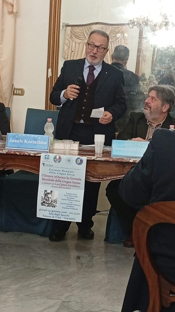 Με θέμα: “Η θεσμοθέτηση του εορτασμού της Παγκόσμιας Ημέρας της Ελληνικής Γλώσσας από την UNESCO” πραγματοποιήθηκε χθες, Πέμπτη 29 Ιανουαρίου 2026, διάλογος του καθηγητή που συνέλαβε την ιδέα Ιωάννη Κορίνθιου με τον καθηγητή Marko Galdi, πρόεδρο του Φιλελληνικού Συλλόγου Sosieta Fillenica Italiana και τον καθηγητή Giancarlo Antonucci, πρόεδρο του Πολιτιστικού Συλλόγου Dopolavoro Fillenico του Τάραντα.