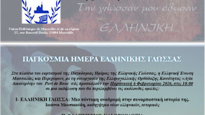 Με αφορμή τον εορτασμό της Παγκόσμιας Ημέρας Ελληνικής Γλώσσας, η Ελληνική Ένωση Μασσαλίας και Περιχώρων, σε συνεργασία με την Ελληνογαλλική Ορθόδοξη Κοινότητα «Αγία Αικατερίνη» του Port-de-Bouc, διοργανώνουν την Παρασκευή 6 Φεβρουαρίου 2026, στις 18:00, εκδήλωση αφιερωμένη στην ελληνική γλώσσα.
