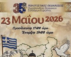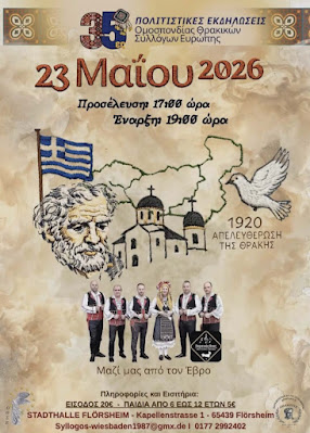Στις 23 Μαίου 2026 θα πραγματοποιηθούν οι 35ες πολιτιστικές εκδηλώσεις της Ομοσπονδίας θρακικών συλλόγων Ευρώπης -σε συνεργασία με τον Εκπολιτιστικό Σύλλογο Θρακιωτών Βίσμπαντεν «Δημόκριτος».